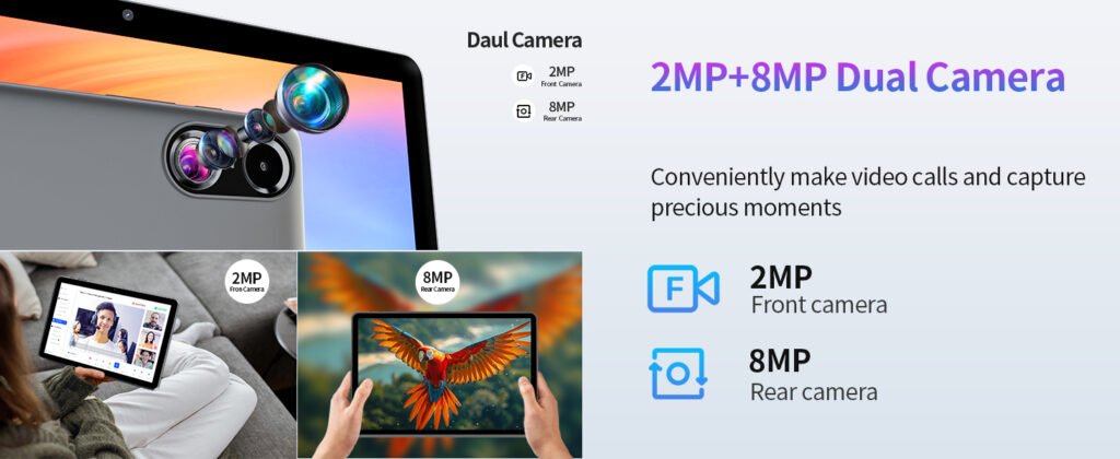 • Dual Cameras & Speakers] ✨With the 2.0MP front camera and 8.0MP rear camera that brings your photos and videos to life. PRITOM 10 inch Android tablet is ideal for taking photos, capturing and sharing special moments with friends and family. Compared to most 10-inch tablets, the PRITOM tablet is equipped with dual speakers that deliver powerful sound and immerse you in the world of sound