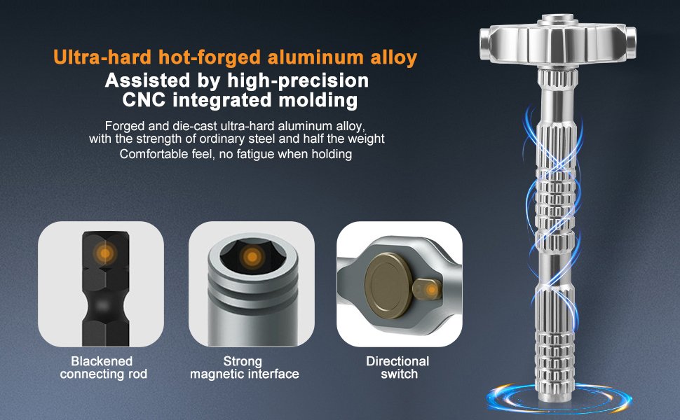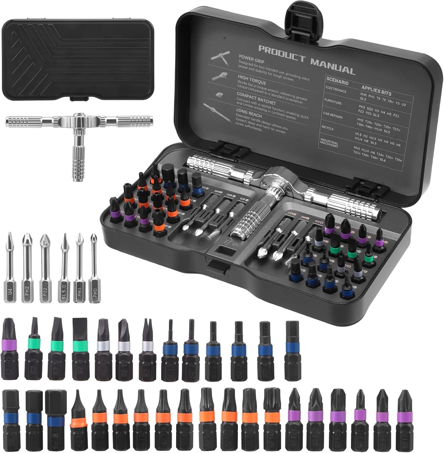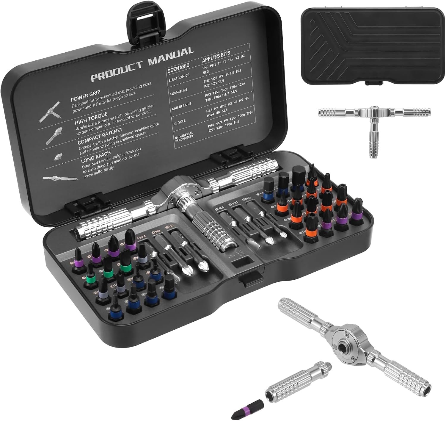 40-in-1-Schraubendreher-Set: Dieses Ratschenschraubendreher-Set enthält 6 Bits mit langem Schaft und 32 Bits mit kurzem Schaft. Es umfasst eine große Auswahl an wichtigen Bits wie Phillips, Schlitz, Innensechskant und Torx. Die magnetischen Komponenten verbinden sich sicher und lassen sich in der Länge anpassen, um auch enge oder schwer zugängliche Stellen zu erreichen. Starkes Drehmoment: Dieses magnetische Schraubendreher-Set bietet ein maximales Drehmoment von 40 Nm und ist äußerst robust. Es eignet sich perfekt für Möbelmontage, Reparaturen an Haushaltsgeräten, präzise Reparaturen an Elektronikprodukten, Fahrradreparaturen usw. Ein unverzichtbares Werkzeug für Profis und Heimwerker. Robustes Metallmaterial: Das Präzisionsschraubendreher-Set besteht aus einem T-Griff aus Aluminiumlegierung und Bits aus hochfestem S2-Legierungsstahl. Beide Komponenten sind für den harten Einsatz konzipiert und besonders langlebig. Die verschiedenen Bit-Typen sind zur einfachen Unterscheidung und für mehr Komfort farblich gekennzeichnet. Magnetischer Schraubendrehersatz: Der Griff verfügt über einen integrierten, starken Magneten, der die Sechskantbits sicher hält. Jedes Bit ist magnetisiert, um Schrauben fest zu fixieren, ein Abrutschen zu verhindern und die Präzision zu erhöhen. Die Bits sind farblich gekennzeichnet und entsprechen den entsprechenden Markierungen in der Box. So sind sie auf einen Blick erkennbar und lassen sich leicht entnehmen und verstauen. Die Aufbewahrungsbox besitzt eine integrierte Magnetisierungskammer, die die Bits magnetisiert und für dauerhaften Halt sorgt. Das perfekte Geschenk für Heimwerker: Unser Ratschenschraubendreher-Set ist das ideale Geschenk für jeden Heimwerker. Dank seiner kompakten Größe ist es leicht zu transportieren. Die schwarze Phosphatbeschichtung verleiht ihm ein ansprechendes, industrielles Aussehen. Die robuste Aufbewahrungsbox sorgt für Ordnung bei den verschiedenen Bits und erleichtert den Transport unterwegs. So geht nichts verloren.