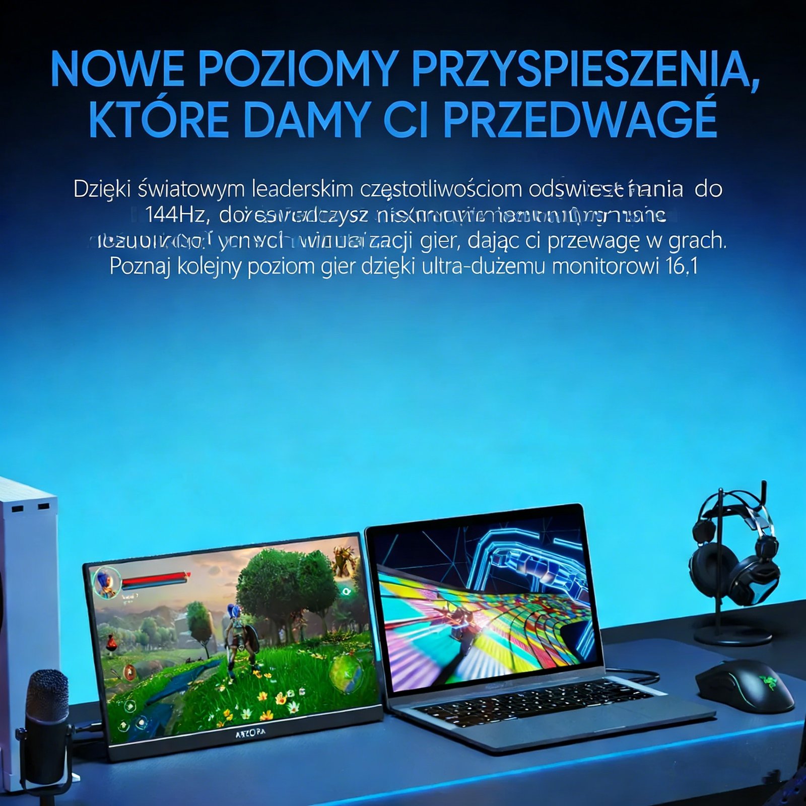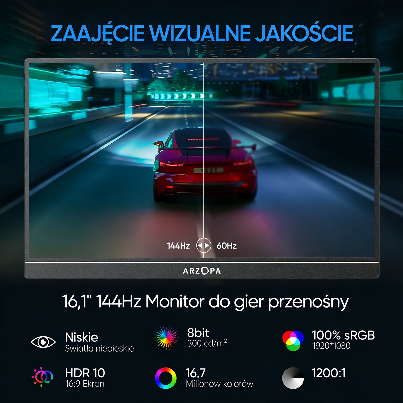 ARZOPA przenośny monitor 16,1″/17,3″ FHD 1080P 60Hz/144Hz, przedłużacz ekranu laptopa do komputera PC, Mac, Xbox Switch, PS5, iPhone, wyświetlacz IPS, wyświetlacz komputerowy, HDR, ekran zewnętrzny, gra, praca z domu