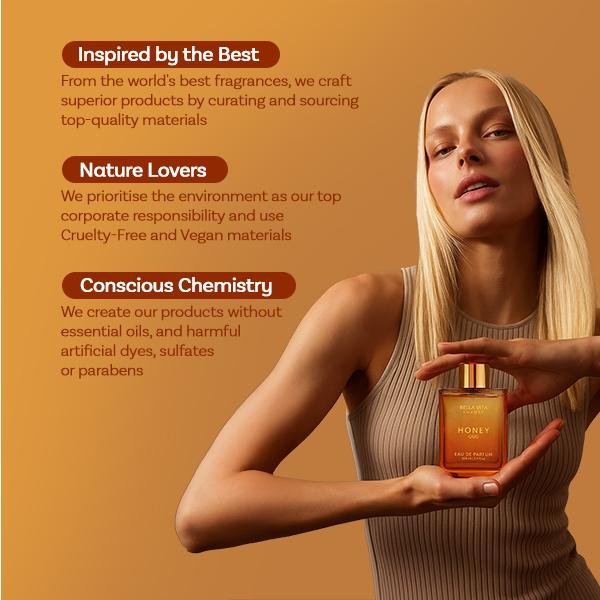 Crafted with the finest European-sourced essential oils and expert Indian artistry, this Eau de Parfum unfolds in exquisite layers to captivate the senses. Bright top notes of luscious honey and zesty bergamot greet the nose first, offering an instant burst of sweet freshness; the heart reveals a sophisticated blend of rare oud, romantic rose and earthy patchouli, where floral softness meets woody depth; the base settles into a warm, enveloping embrace of oud, amber, creamy vanilla and smooth musk, adding lasting warmth and a subtle spicy finish that defines the fragrance’s unique character.