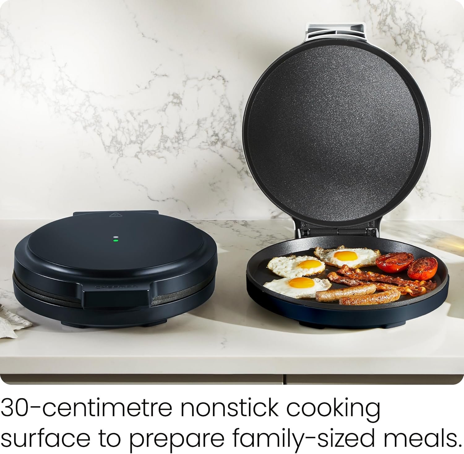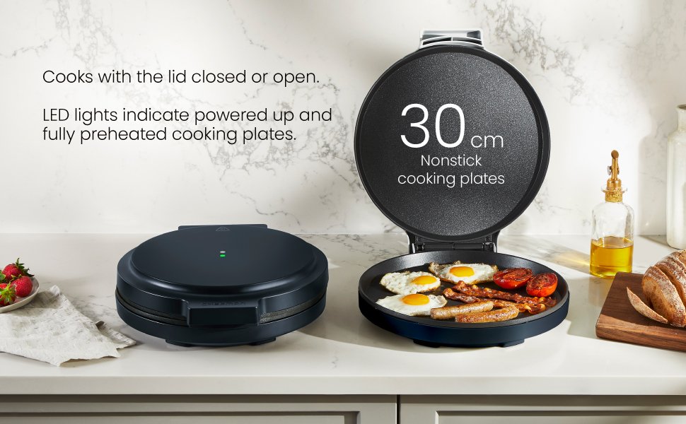 • HIGH-HEAT COOKING: The quick-heating electric skillets on the top and bottom reach a high of 220°C for that perfect crunch on pizza crust or to finish crisping the tortilla for a suppertime quesadilla
