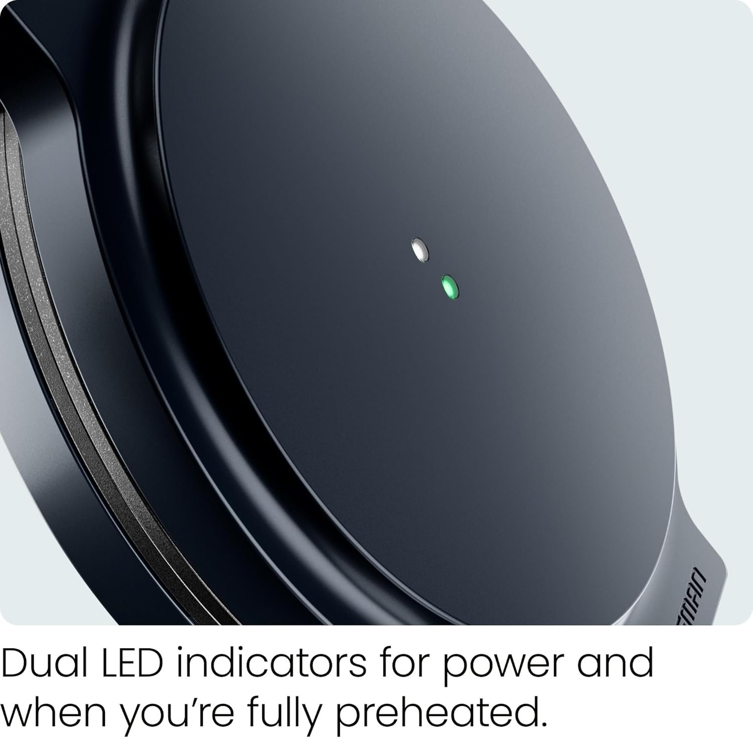 • LED INDICATOR LIGHTS: Dual lights show when the pizza cooker has power and is fully preheated. The unit reaches temperature in as little as 3 minutes, so you don’t need to spend ages waiting for dinner
