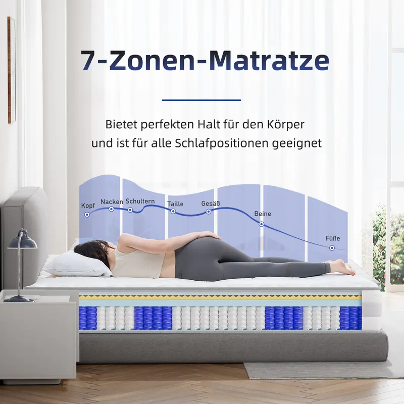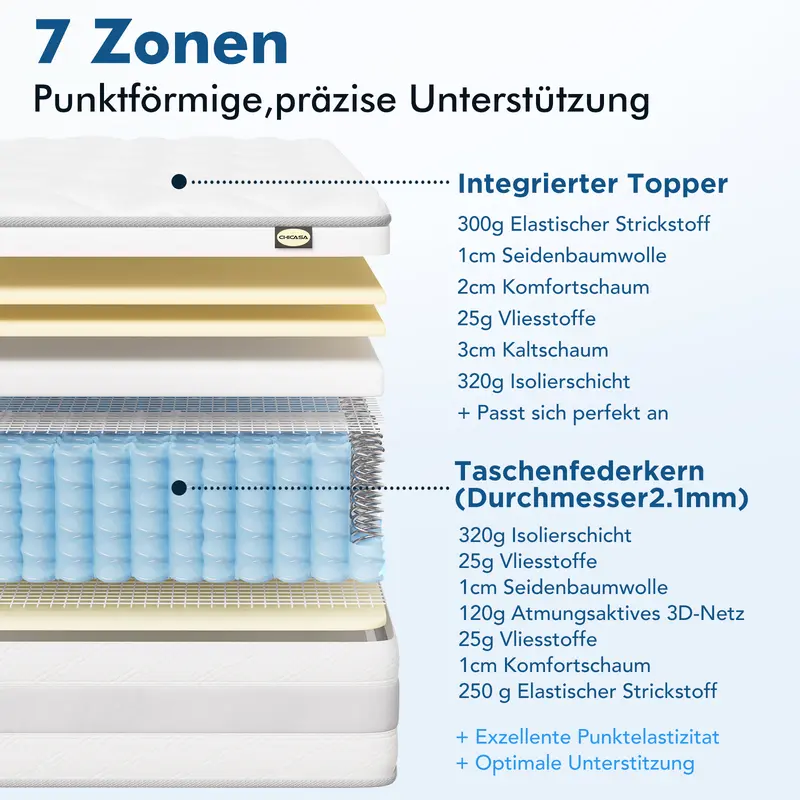 CHICASA Taschenfederkernmatratze – Luxuriöse 7-Zonen Matratze, hoher Komfort, H3/H4, 10 Schichten, 25 cm Höhe