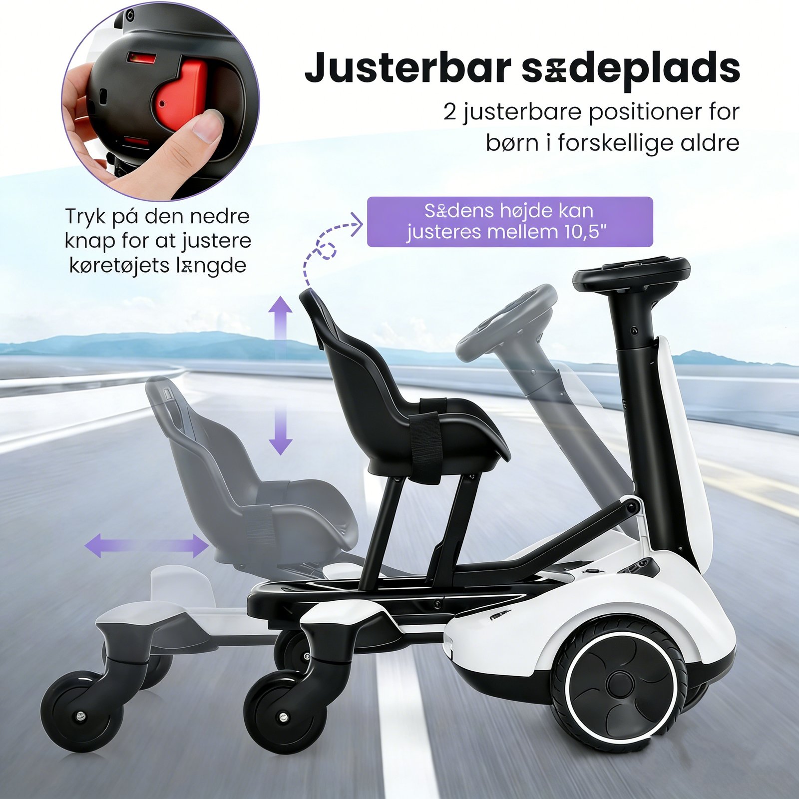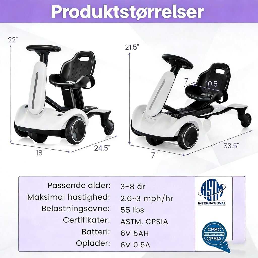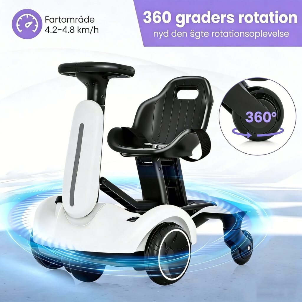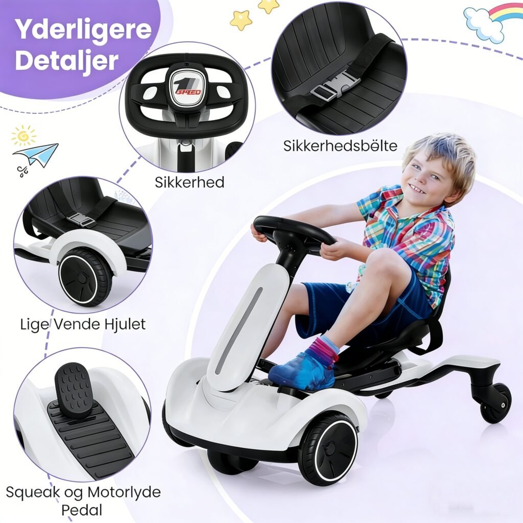 • Realistisk spinning og drifting – Den elektriske drift-gokart er udstyret med en 6V-motor, der perfekt understøtter højhastighedsoplevelser i området 4-5 km/t. Med drivhjul og pedaler kan dit barn nemt manøvrere bilen til 360-graders spins og drifting, hvilket træner deres kropskoordination og balance.