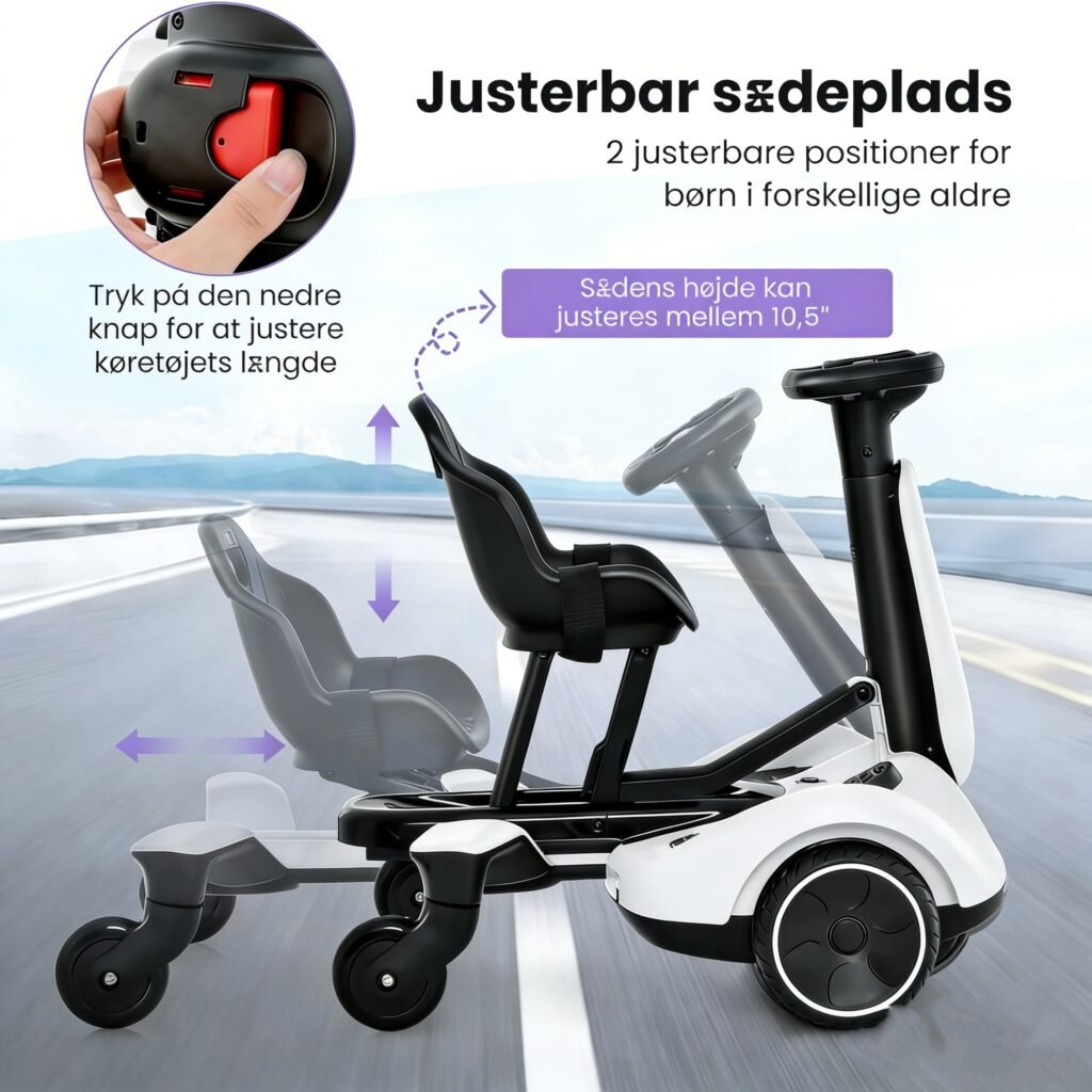 • usterbar sædeposition – Vores elektriske driftbil har 2 brugerdefinerbare sædepositioner, der kan tilpasses dit barn, efterhånden som det vokser. Tryk på den nederste knap for at justere bilens længde, hvilket giver op til 23 cm justerbar plads. Sædehøjden kan også nemt justeres mellem 25 cm og 33 cm, hvilket gør den perfekt til børn i forskellige aldre.