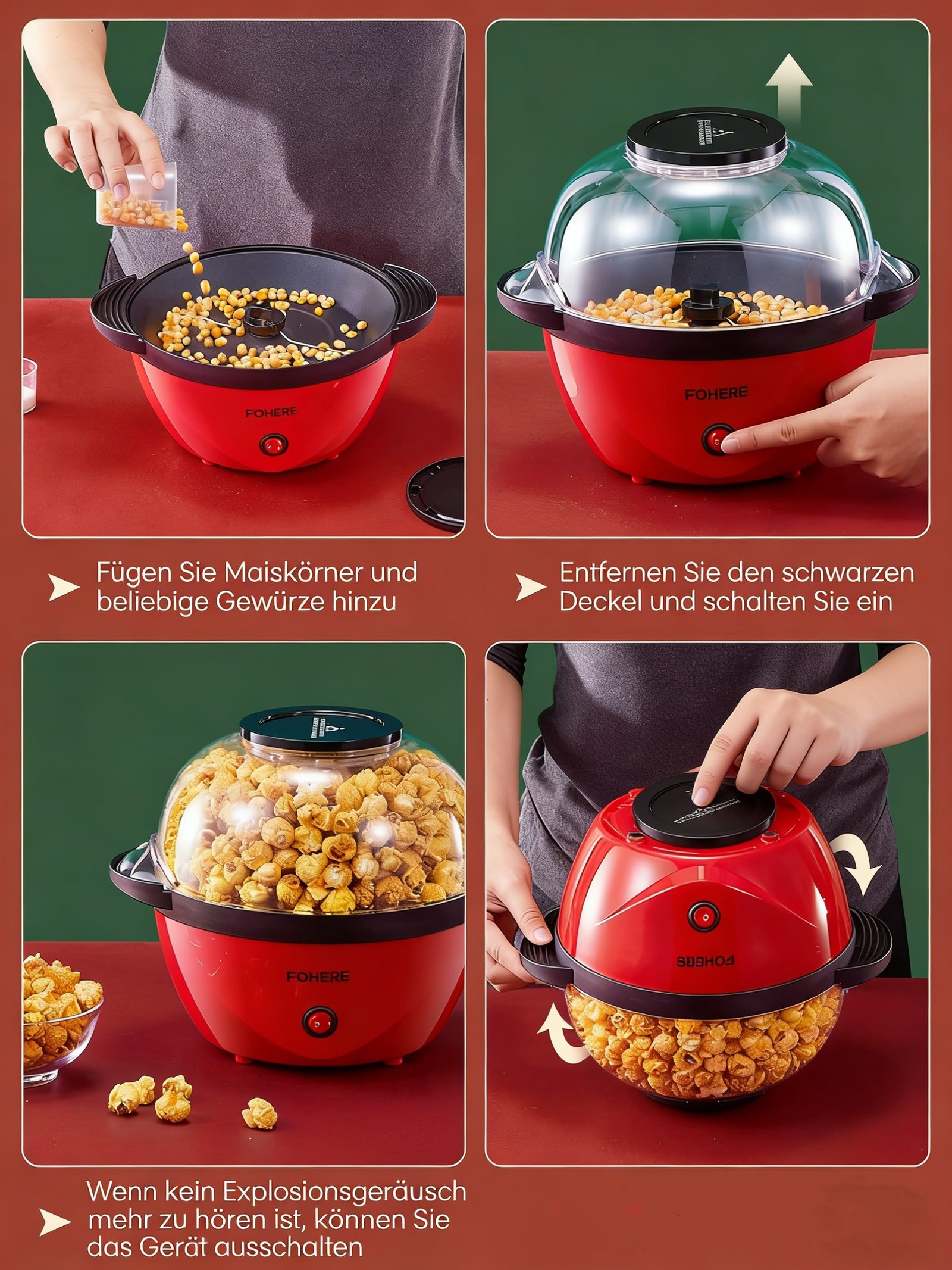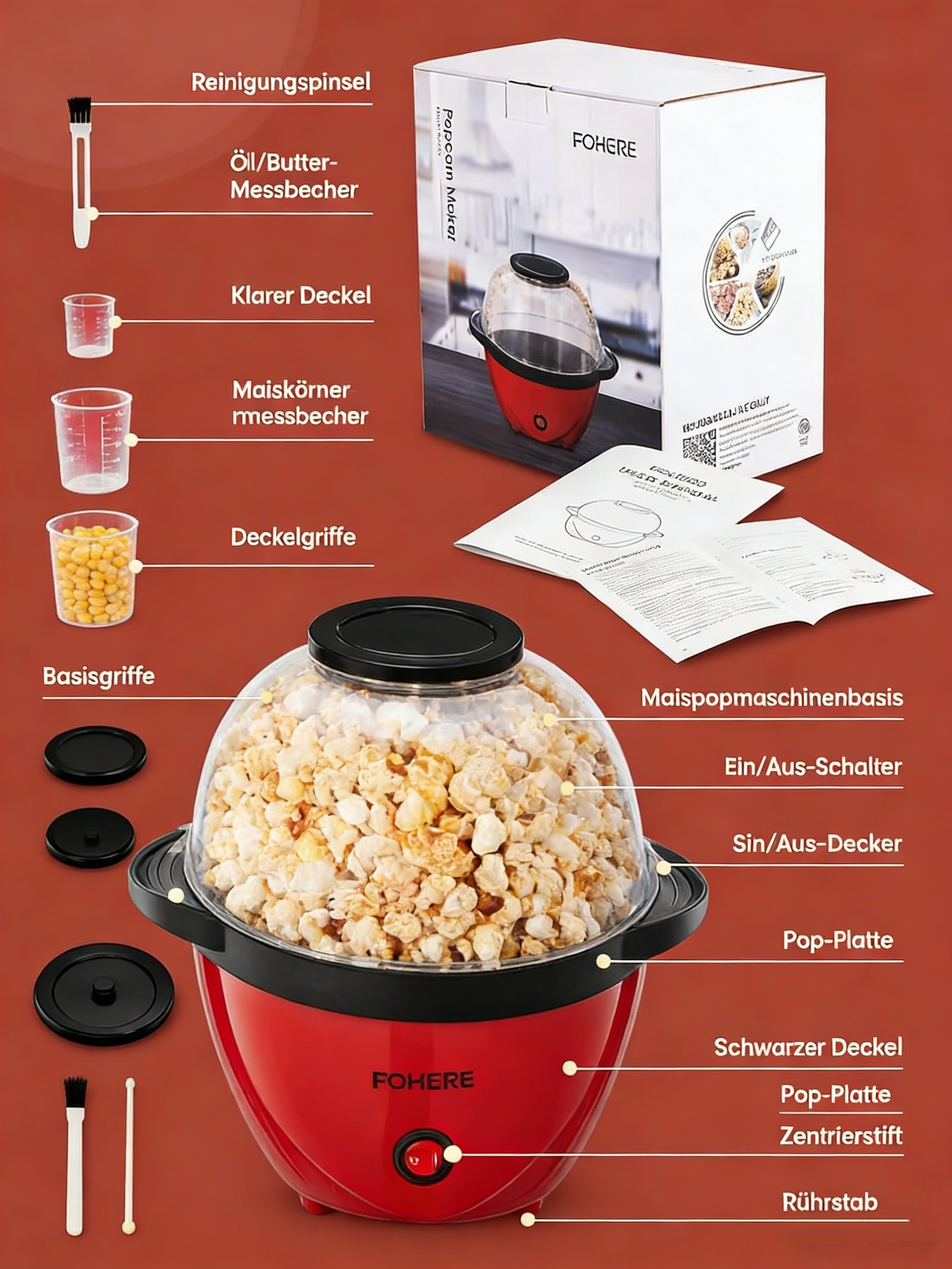 FOHERE-Home Popcornmaschine, 5,5 L Popcornmaschine mit Zucker, Öl, Butter, Antihaftbeschichtung und abnehmbarer Heizfläche, leise und schnell, großer Deckel als Servierschale