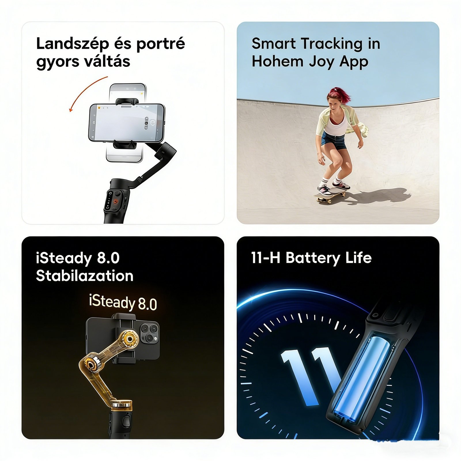 • [Hohem Joy App, Easy-to-Use Shooting Modes] Paired with the Hohem Joy app, our cell phone gimbal offers various shooting modes such as panorama, timelapse, and slow motion. With Moment creative templates, you can effortlessly create cinematic masterpieces with a simple hand movement.