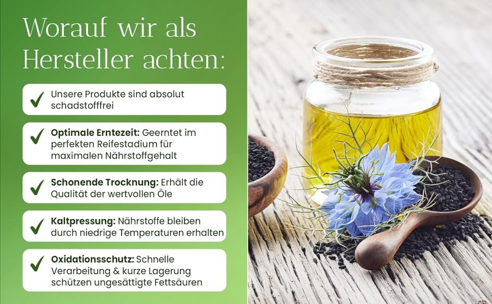 • Freshness: you will always receive mill-fresh black cumin oil, often even fresh from the same day 1. Pressing. However, our oil is max. 2-3 days old. FRESH is an absolute quality feature and can only be offered directly from the manufacturer when delivered. By contrast, you will always receive goods in stock. !