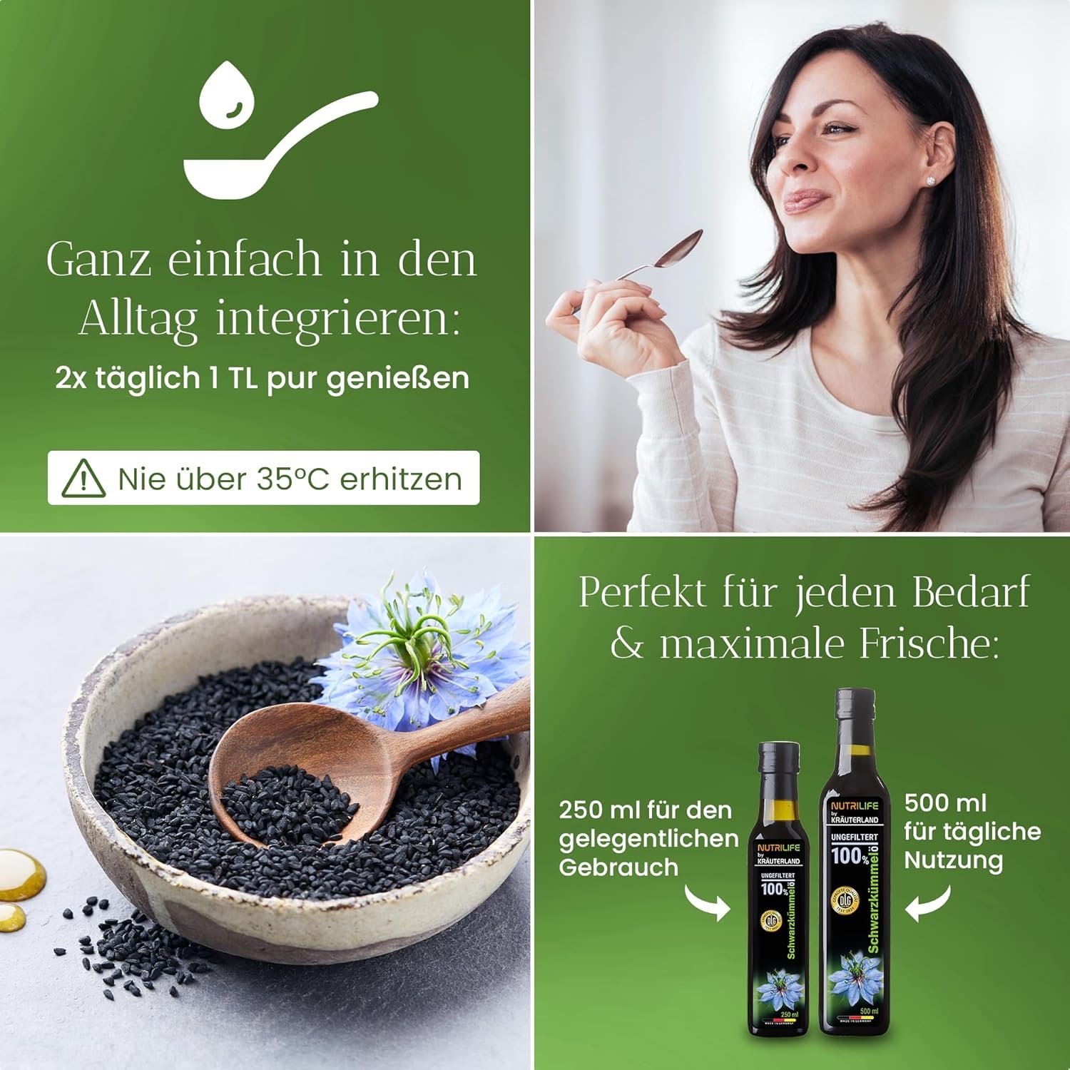 • Use: black cumin oil is very versatile and can be taken 2 x daily 1 teaspoon pure. In addition, our black cumin solution is a great spice and can enhance cold food and salad dressings in a special way.