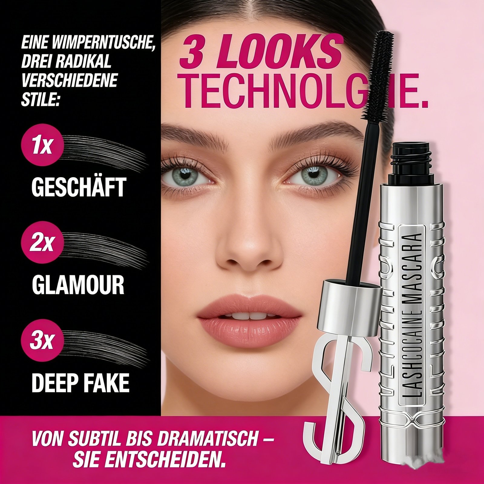 • 3LOOKS TECHNOLOGY – Create 3 signature looks with special coating technology. Multiple applications increase your results! Apply 1x ➡️ Your Everyday classy lashes BUSINESS LOOK. Apply 2x ➡️ GLAMOUR LOOK, which makes you an absolute eye-catcher. Apply 3x ➡️ DEEPFAKE LOOK, which takes your lashes to their most intense styling level.