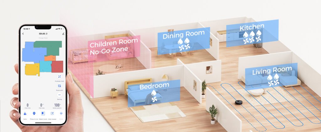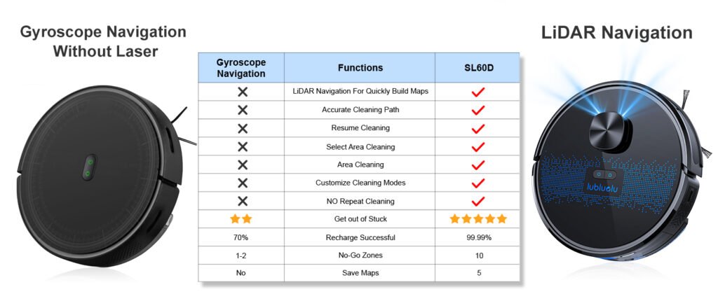 【Lidar-Kartierung und Navigation + 5 Karten】Der SL60D Saugroboter ist mit der innovativen SLAM-Navigation und dem Quad-Core-Chip RK3308 ausgestattet. Seine Kartierungsgenauigkeit ist dreimal höher als die herkömmlicher LDS-Systeme. Dank 8-Meter-Laserreichweite und KI-Erkennungstechnologie umfährt er Hindernisse präzise, passt sich verschiedenen komplexen Wohnumgebungen an und ermöglicht eine genauere und effektivere Routenplanung.