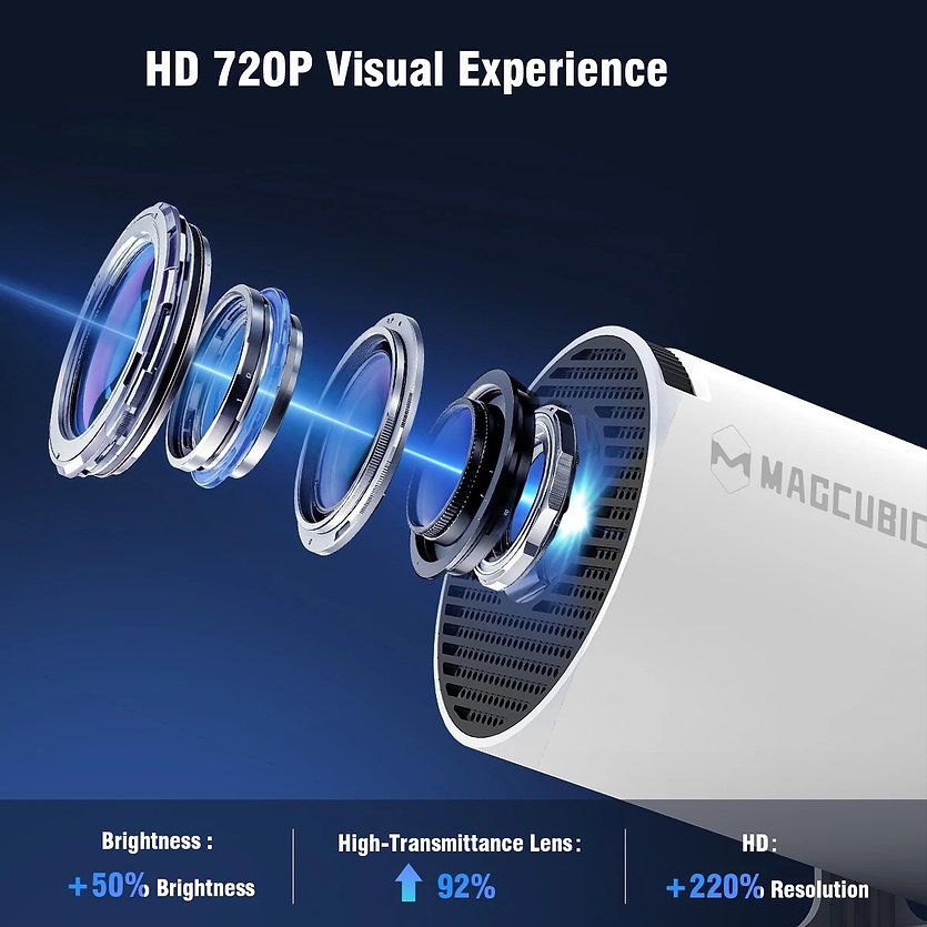 Con una luminosidad de 290 ANSI, el Magcubic HY300Pro garantiza imágenes claras y vibrantes incluso en entornos con luz ambiental, sin necesidad de oscurecer completamente la habitación. Su capacidad de decodificación 4K y resolución nativa 1080P ofrece detalles impresionantes en cada escena, haciendo que películas, series, partidos de deportes o juegos se vean con una nitidez y realismo incomparables. Impulsado por el chip Allwinner H726, el proyector funciona con fluidez, sin retrasos ni interrupciones, incluso al reproducir contenido de alta definición o ejecutar aplicaciones de streaming.