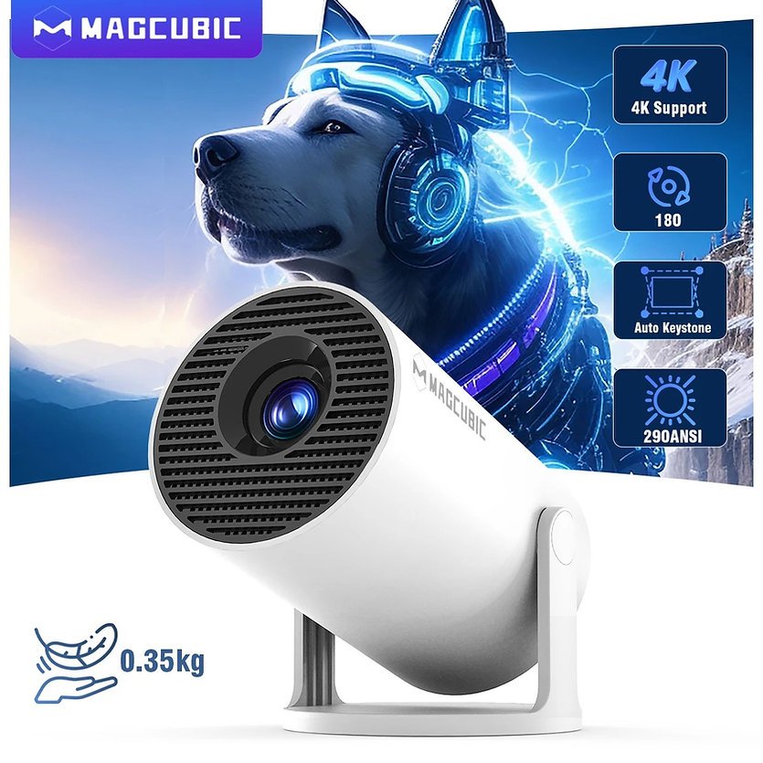 Magcubic HY300Pro Android 14 Proyector 290ANSI Doble WiFi6 Decodificación 4K 1080P Allwinner H726 Corrección Automática de Trapecio Inalámbrico BT5.4 Pantalla de 130″ Incorporado Altavoz Giratorio 180° Mini Cine en Casa Portátil Para Exteriores Video