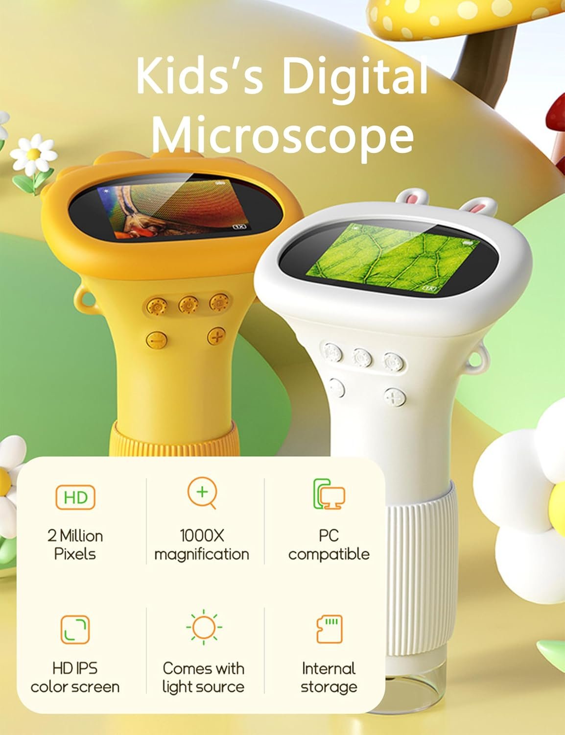 • PANTALLA A COLOR DE 2,0 PULGADAS: La cámara para microscopio infantil cuenta con una pantalla HD de 2 pulgadas que cuida la vista y que facilita y hace más amena la exploración del mundo microscópico, proporcionando una experiencia de visualización en tiempo real clara e intuitiva con un aumento de 1000X para satisfacer las necesidades diarias.