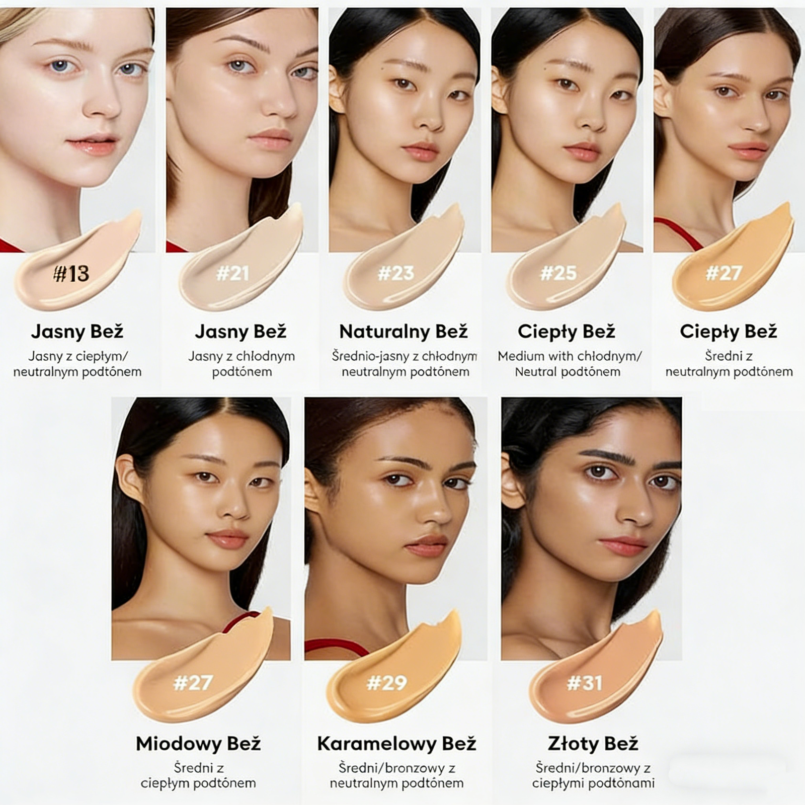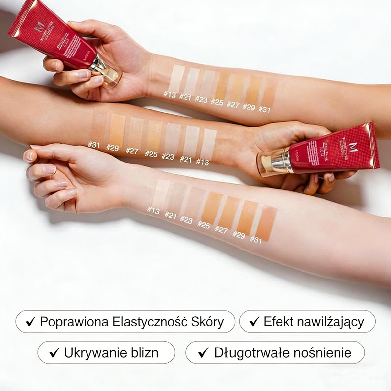 • Średni do wysokiego stopnia krycia: Doskonale kryje niedoskonałości, plamki i zaczerwienienia, dając naturalny, błyszczący efekt. Skóra wygląda idealnie, ale nadal zachowuje swoją naturalność.