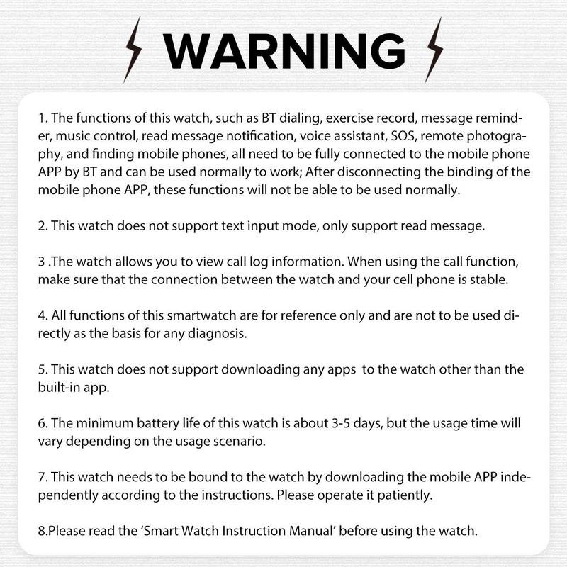 • 【Al Voice Control & Bluetooth Calling】Work with Al Voice assistant, you can ask questions, control music playback, check the weather, set alarms and timers, and more by speaking to your smartwatch. With Bluetooth 5.2, you can also answer/make clear calls directly from your smart watches when your phone is out of reach. (THE WATCH CAN NOT SEND MESSAGES, or TEXT BACK)