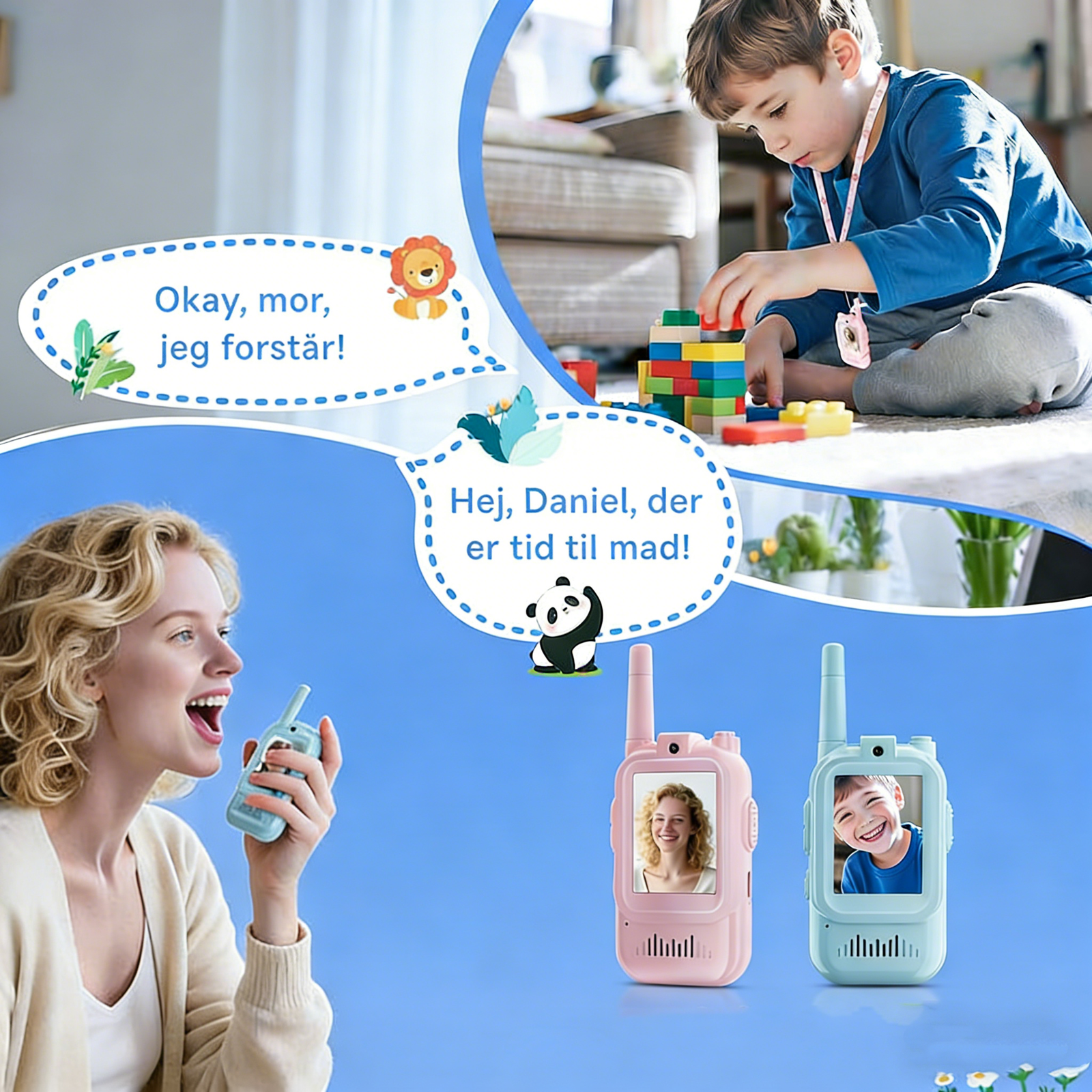 • Video and HD audio: visual walkie talkies for children, anytime and anywhere, more humane. Our walky talky with high anti-interference clear voice technology, which provides a clearer voice and stable signals. Walkie talkies can reach a communication range of 300 m in open areas such as rural areas, suburbs or by the sea etc. where there is no protection. In cities, walkie-talkies can reach 150 m. Stay in touch without a mobile phone.