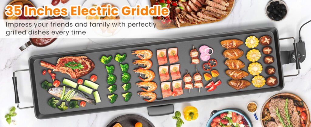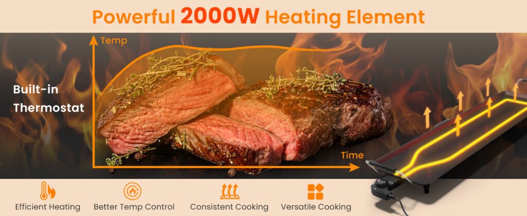 Plancha de asar Eléctrica 90×23 cm Superficie antiadherente a la piedra 2000w con Termostato Regulable y Bandeja para Recogida de Grasa