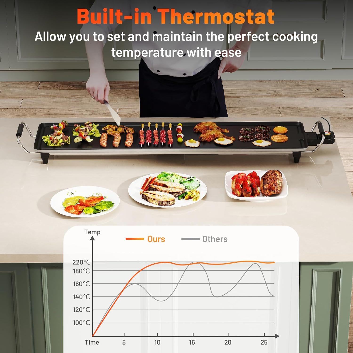 • 【Large & Nonstick Cooking Surface】 This electric griddle boasts a large grilling area measuring 89 × 22cm, serving 8-10 people effortlessly. With a nonstick coating, it is easy to clean the cooking surface. The equipped drip tray and 6 wooden spatulas, the teppanyaki grill offers convenience for your cooking needs.