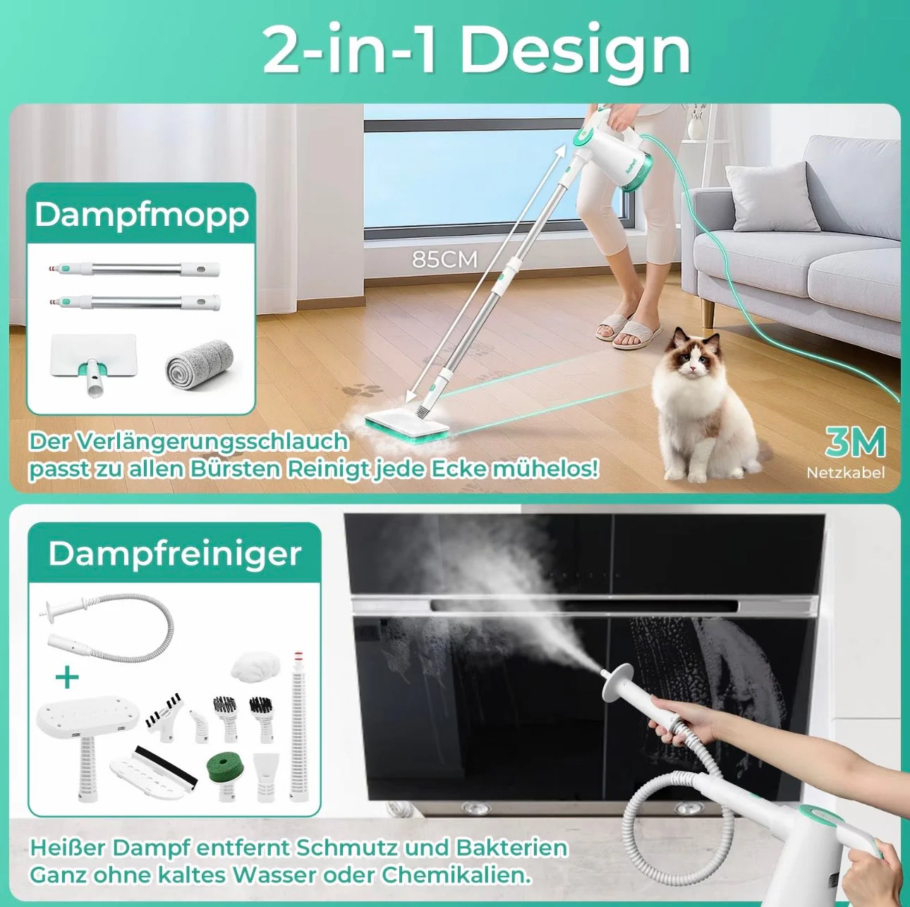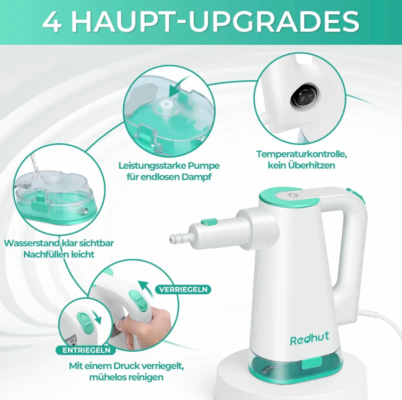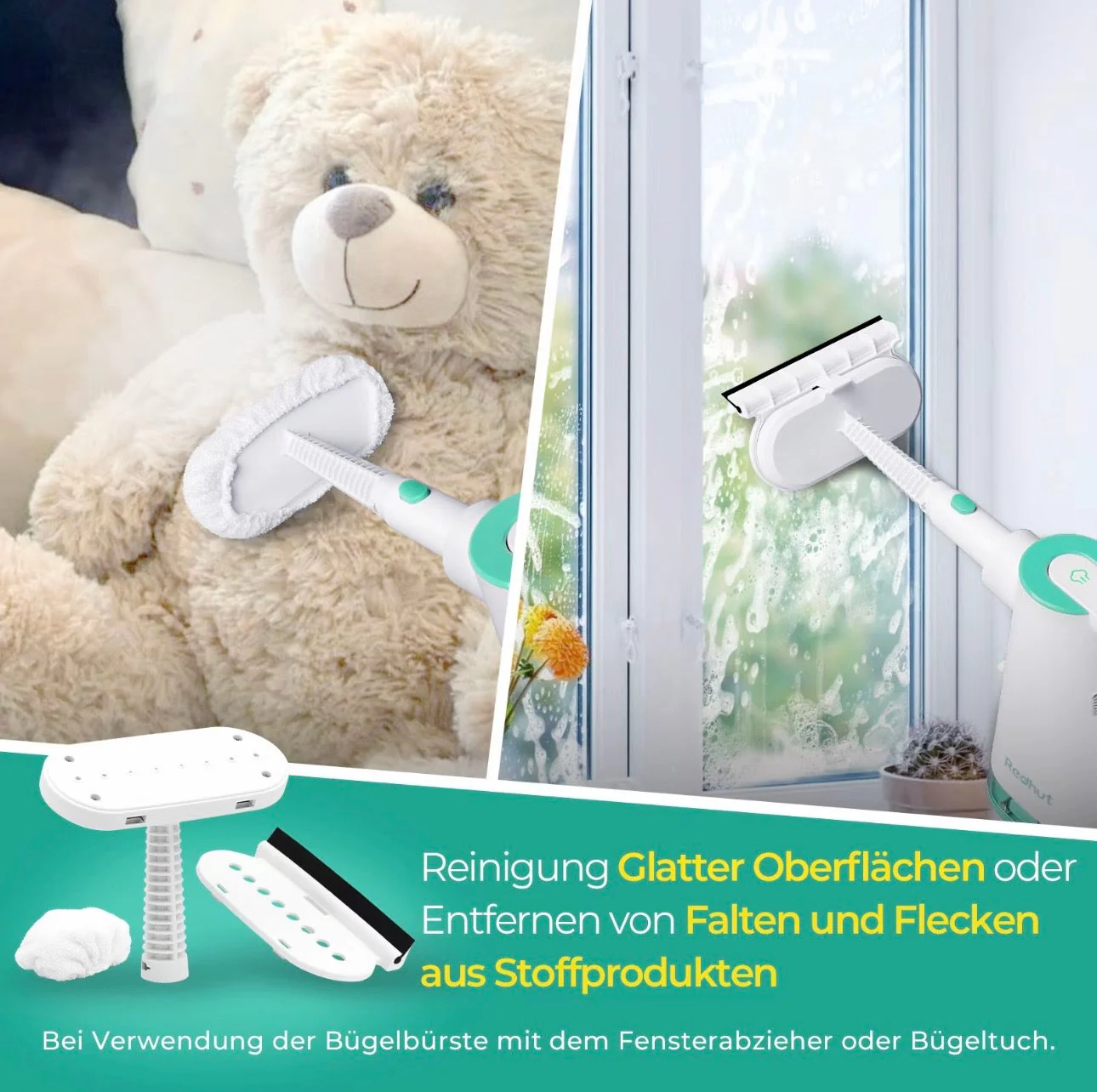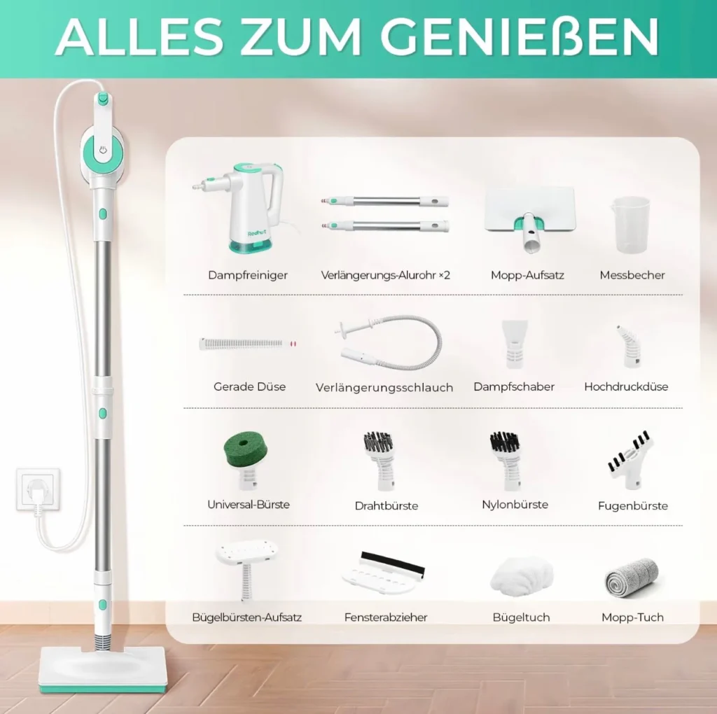 Redhut 14-in-1 Dampfreiniger – leistungsstark, vielseitig und hygienisch Entdecken Sie eine moderne und praktische Art zu reinigen. Mit 11 multifunktionalen Aufsätzen wird der Redhut Dampfreiniger nicht nur zum Bodenreiniger, sondern verwandelt sich im Handumdrehen in einen flexiblen Handdampfreiniger – ideal für Glas, Fugen, Polster, Textilien und vieles mehr.Der abnehmbare 375-ml-Wassertank ermöglicht längere Reinigungseinheiten. Mit bis zu 230°F heißem Dampf unter Druck entfernt das Gerät Fett und Schmutz zuverlässig – ganz ohne Chemikalien, sicher für Kinder und Haustiere.Praktische Details wie das 3 m lange Kabel und die waschbaren Mikrofaser-Pads machen die Anwendung komfortabel und umweltfreundlich. Dank des kompakten Designs erreichen Sie mühelos auch schwer zugängliche Stellen.