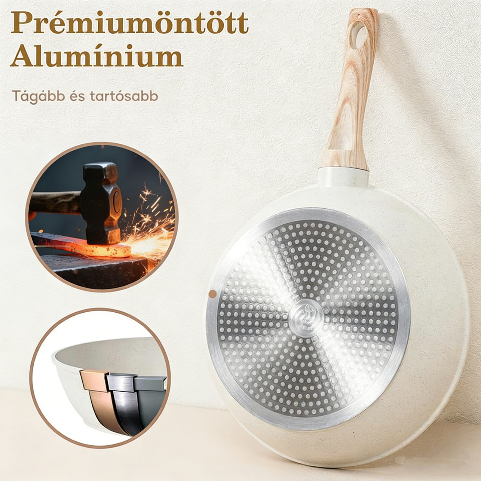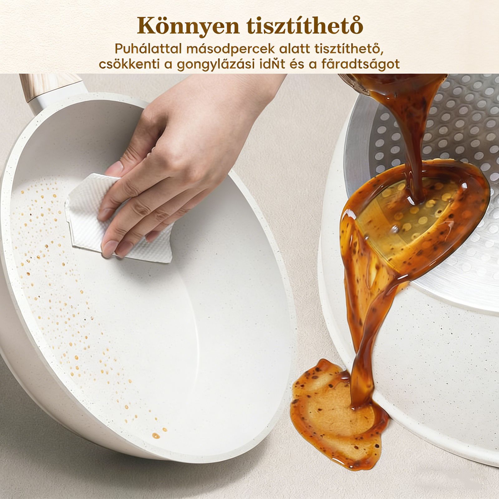 • A professzionális minőségű, háromrétegű hegesztés nélküli réteg megakadályozza az étel tapadását, így alacsony zsírtartalmú, egészséges főzést tesz lehetővé.
