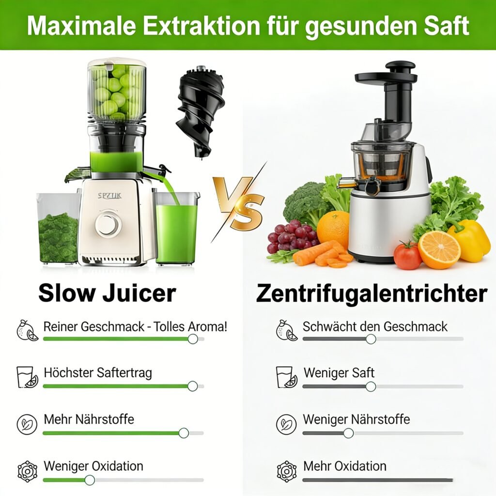• 【 99% Juice Yield and Maximum Nutrition】 Silky Smooth, No Waste. Extract 50% more vitamins, minerals and enzymes than centrifugal juicers! Our slow masticating juicer machines use 58 RPM cold press tech for fresh, pulp-free juice with zero clogging. Enjoy nutrient-packed spinach & celery shots with every sip.