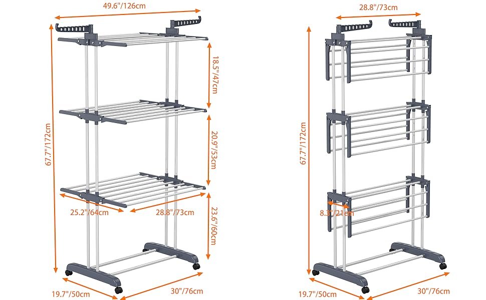 • 【Large 4 Tier Clothes Airer】Size:76L x 50W x 172H cm Large 4 tier design and 2 side wings with hooks for drying clothes, towels, socks, shoes, quilts, etc. There are a total of 24 bars, 14 hooks on 2 side wings for extra hanging drying. This clothes airer can be used to dry up to 62 garments, providing enough space to dry the whole family’s clothes.