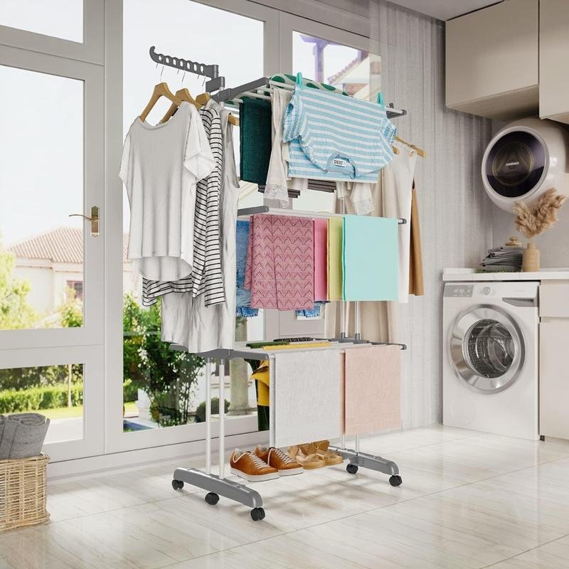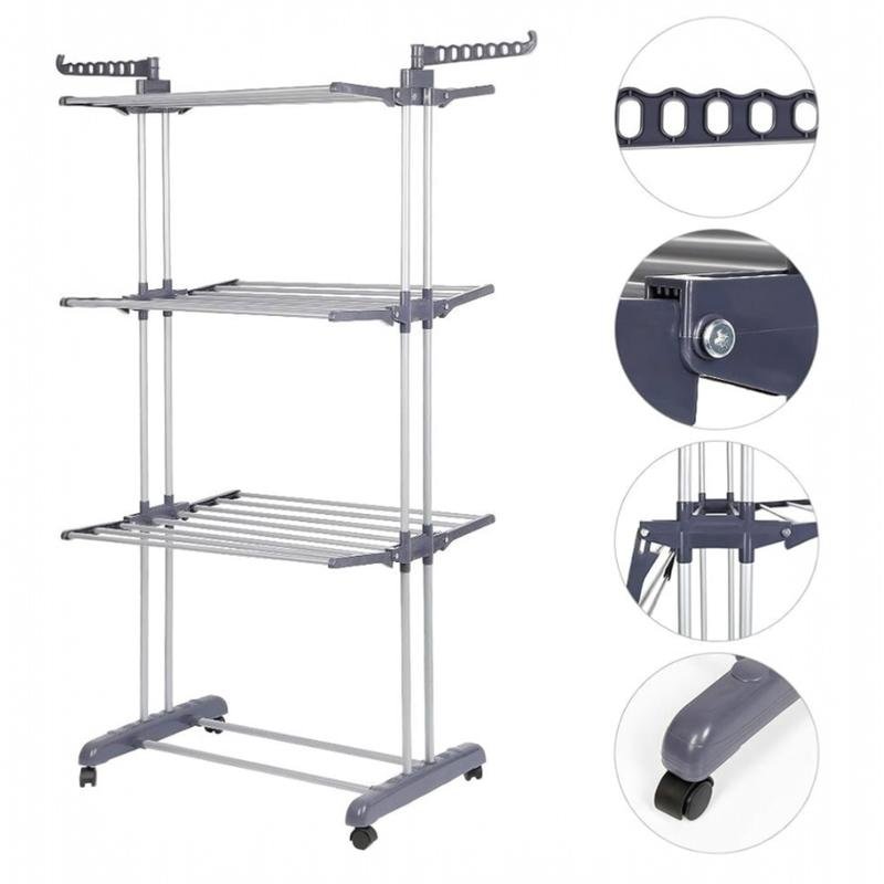 • Sturdy clothes airer: The clothes airer is made of stainless steel with high hardness and thick plastic and is equipped with strong double columns on both sides, which are more stable than ordinary clothes airers.