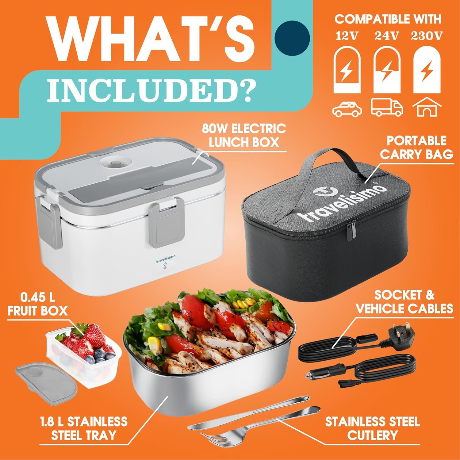 TRAVELISIMO-Elektrische Fiambrera für Lebensmittel, 80W, 1,8L, 3 in 1, 12V / 24V / 220V