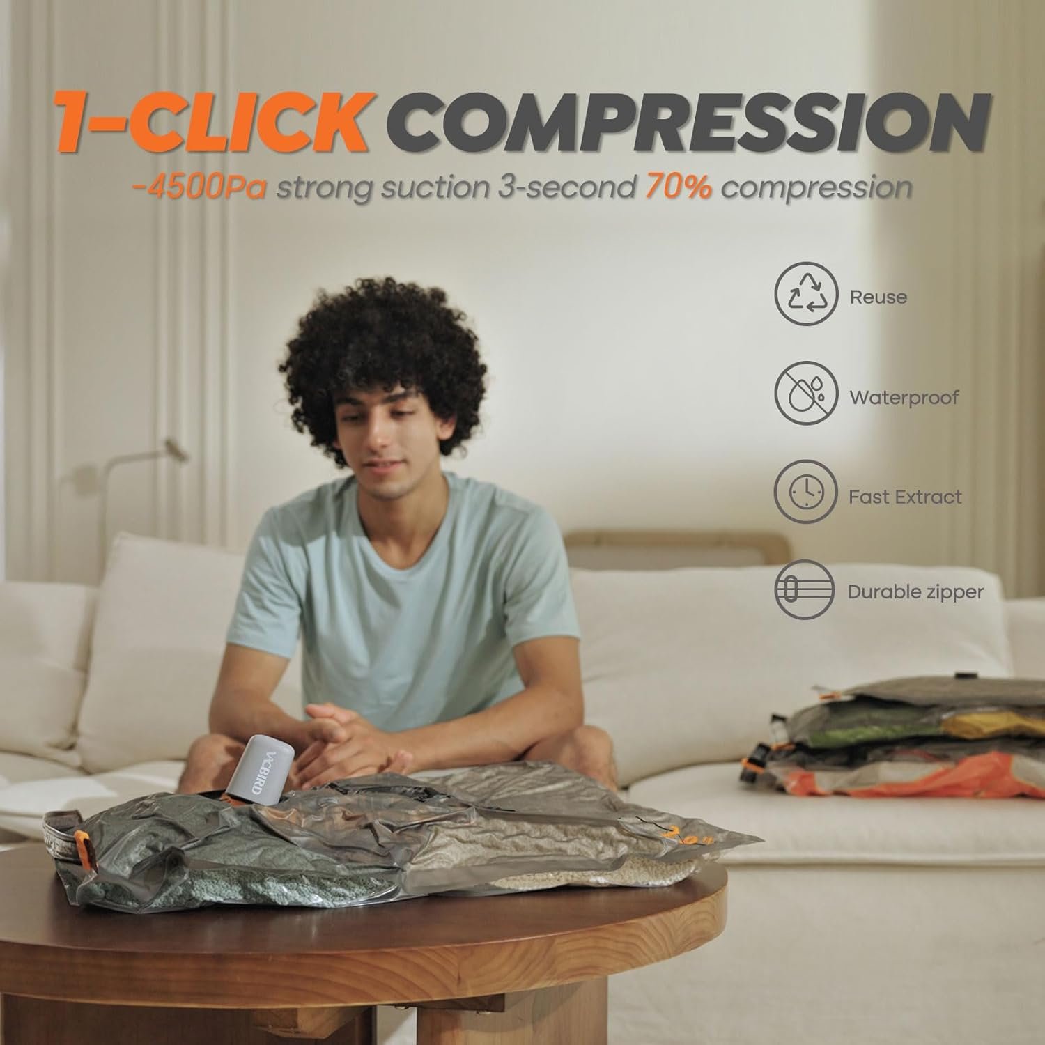 • EFFICIENT & PORTABLE WIRELESS VACUUM PUMP Built in 1800mAh battery, which can be used repeatedly after charging. With a suction power of -4500 Pa, it quickly the air in the bag, saves time and is suitable for quick storage when travelling