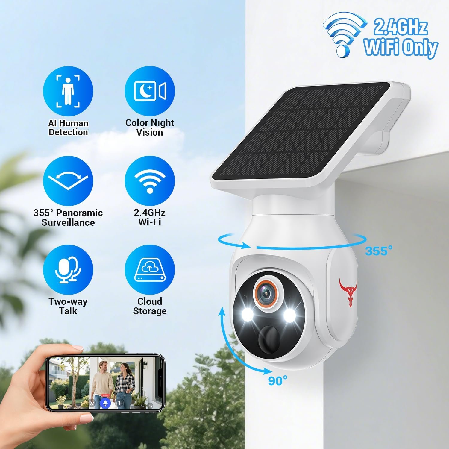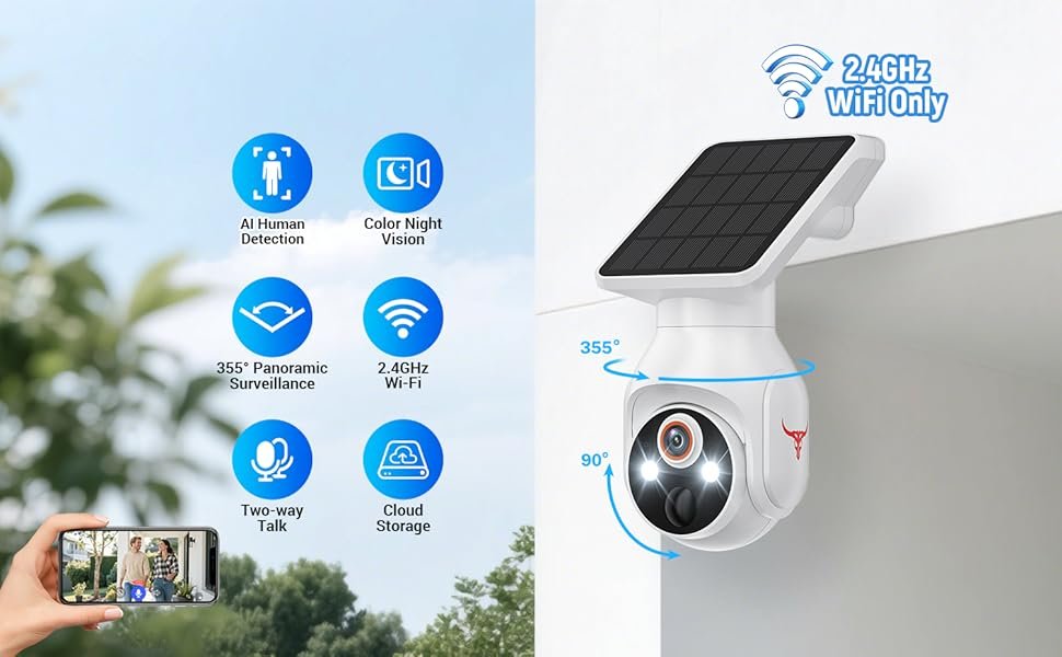 Wireless Solar Security Camera for Outdoor, Battery-Powered WiFi Surveillance, Human Detection, Color Night Vision, 2.4G WiFi, Live View & Cloud Storage